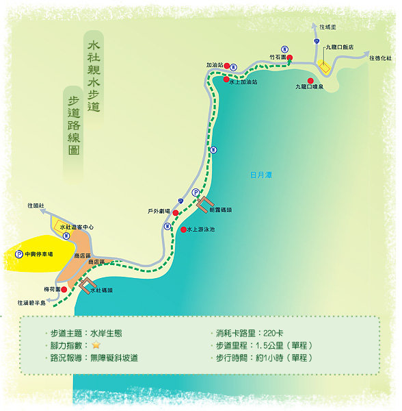 約2.5小時車程,直接殺到日月潭,水社親水步道全長1.5公里,水社碼頭(起點)-->朝霧碼頭-->竹石園(終點), 步道沿著日月潭邊,風景優美,大部分為景觀木棧道,平坦好走,老少皆宜,來回一趟慢慢走約1.5小時