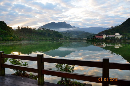 第二天一早,2012 年的第一天,老天爺賞給我們一個美麗的天氣,寧靜的湖面,清甜的空氣,鳳凰山腳的山嵐,加上這2012年的第一道曙光從麒麟潭東方穿雲而出,映照在平靜的湖面上,好一幅美麗動人的景象,再辛苦再遠也都值回票價!