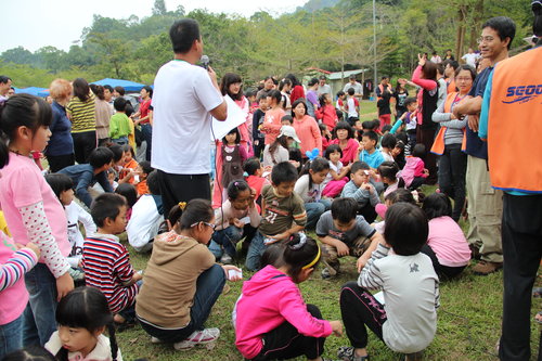 闖關遊戲開始前小朋友集合在一起,賴班長叔叔說明遊戲規則