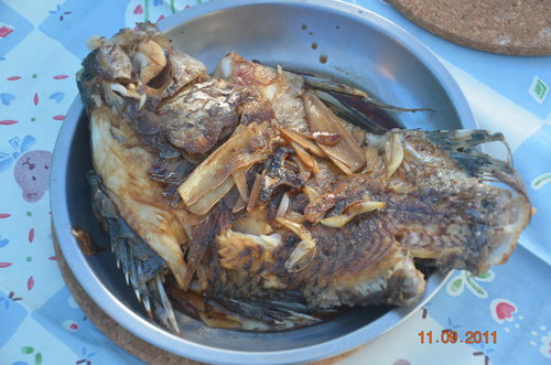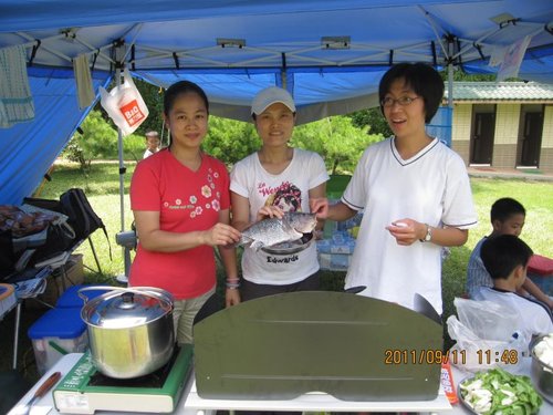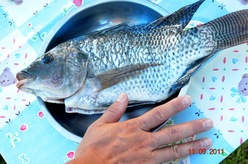 沒關係,還好有偷學到老闆的絕招,第二天早上再度挑戰,用老闆的招數依樣化葫蘆,這回果然大魚上鉤,總共釣到三條各約1~2斤大的吳郭魚,很有成就感耶。留下一條最小的約1斤半(老闆算一斤)現宰現煮,其餘放回池裡,下回再來釣